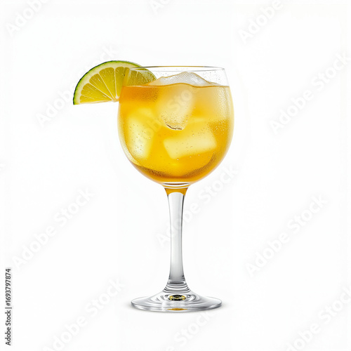 Isolated Tequila Sunrise on a white background Refreshing cocktail in elegant glass with lime slice and ice cubes