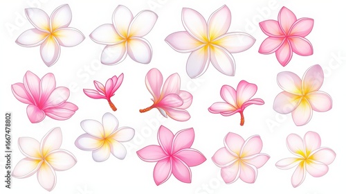 Isolated white and pink Plumeria outline vector illus
