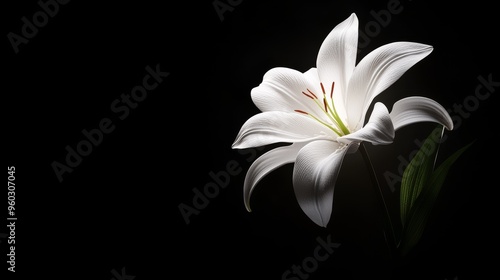 Isolated white lily floating against a black background, soft spotlight highlighting textures, Surrealism, 3D rendering, Monochromatic