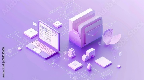 Isometric 3D file processing icon on white in purple pastel background. 3D image in high resolution.