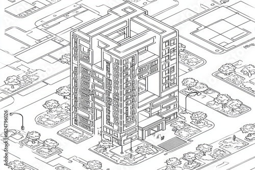Isometric drawing of a modern apartment building and surrounding city streets.