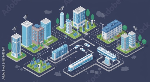 Isometric illustration of a futuristic city with interconnected buildings, roads, and vehicles utilizing green energy sources