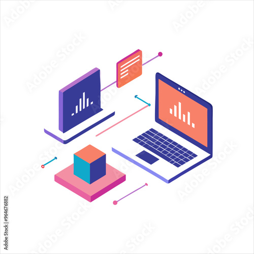 Isometric illustration of dual laptop with coding data analytics and AI symbol in a modern style,