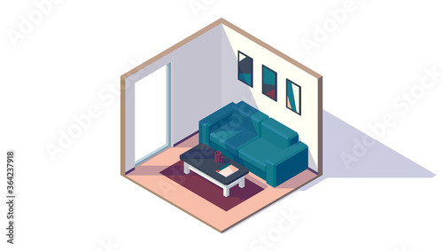 isometric low poly living room interior, couch, picture, window, coffee table, vector illustration