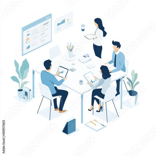 Isometric Office Team Meeting with Digital Tablets and Data Analysis