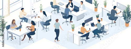 Isometric vector illustration of people in an office, working together at tables and desks, against a white background.