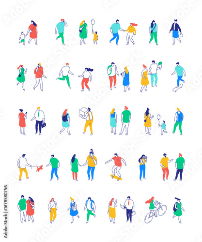 Isometric vector illustration of urban people in colorful flat style. Families, couples, and individuals walking, relaxing, cycling, skateboarding, and enjoying leisure.