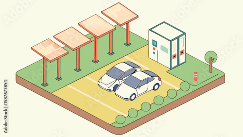 Isometric view of electric vehicle charging station with solar panels and parking for eco friendly cars