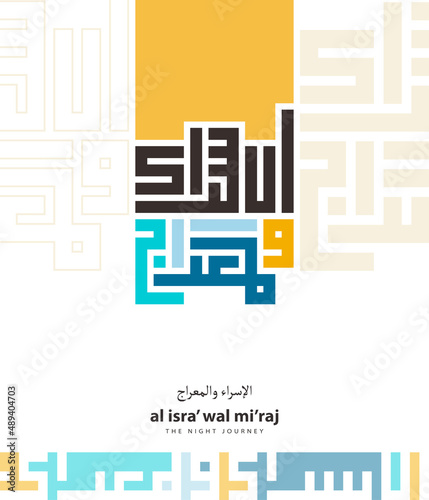 Isra and Miraj Arabic Kufic Calligraphy. (Translation: The Prophet Muhammad's Night Journey and Ascension)