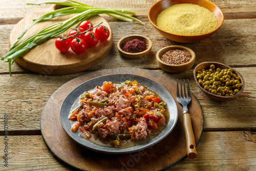 Israeli style couscous with sumac and chicken stew pieces on the table in a plate next to spices and vegetables and couscous grits.