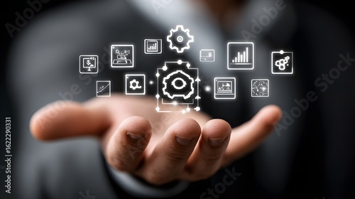 IT Consulting. Businessman holds digital consulting network connecting icon representing IT solutions, focusing on innovation, strategy, optimization, growth, and technology-driven success