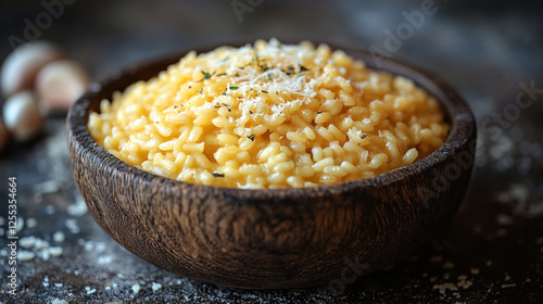 Italian food featuring risotto Milanese served with fresh Parmesan and herbs