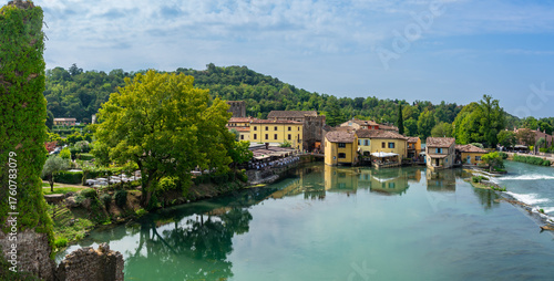Italien, beliebtes Ausflugsziel nähe Gardasee: Der malerische Ort Borghetto bei Valeggio sul Mincio am Fluss - Panorama, Weitwinkelaufnahme