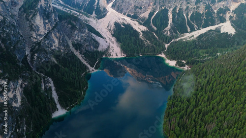 Italy dolomites natural park braies lake surroundings boats and general images with drone