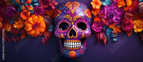 Ivory skull decorated with intricate floral patterns and vibrant red flowers against a dark background