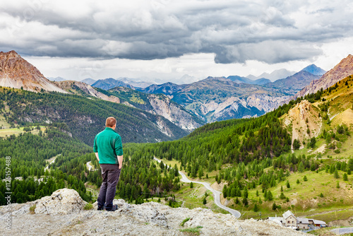 IZOARD PASS, FRANCE: tourist observing surrounding mountain peaks towards the North and Cervieres road, top of famous high altitude alpine pass, Mercantour National Park, Alpes de Haute Provence