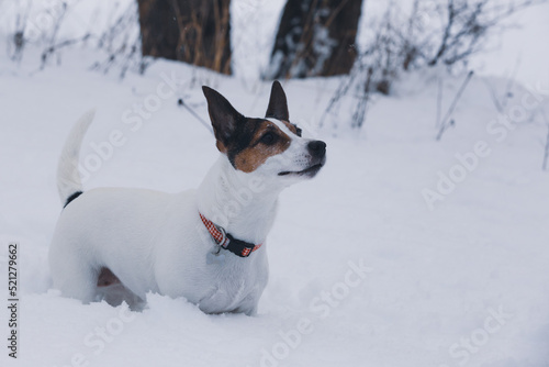 Jack Russell Terrier dog standing in deep snow observing something in the distance