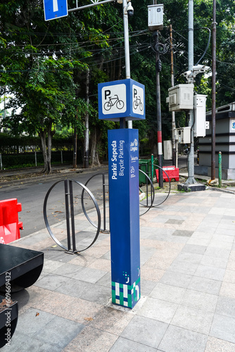 Jakarta, Indonesia, November 9, 2022: Bicycle parking facilities or bike racks at Jakarta MRT stations, KRL Commuterline, and near Transjakarta bus stops.