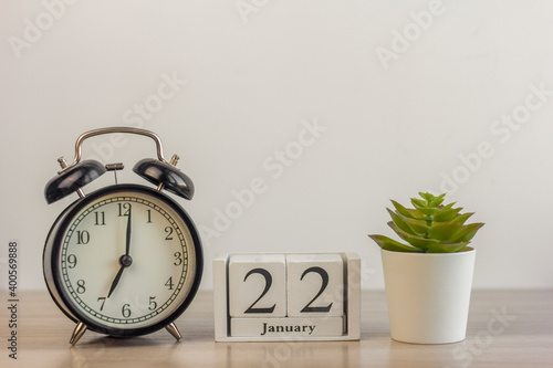 January 22 on a wooden calendar, next to a retro alarm clock and a succulent in a mini pot on a light table.One day in January.Winter day.A copy of the space.Workplace.