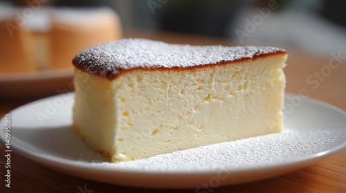 Japanese cheesecake slice soft and jiggly, powdered sugar