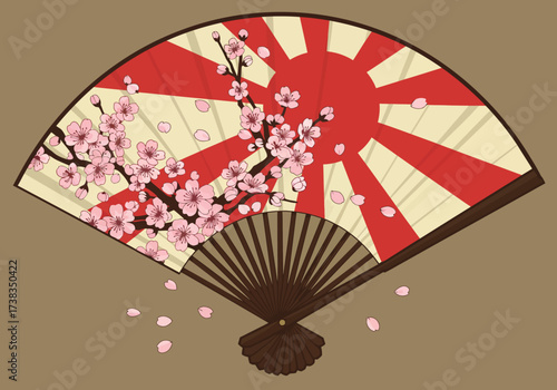 Japanese Fan with Rising Sun and Cherry Blossoms Design.