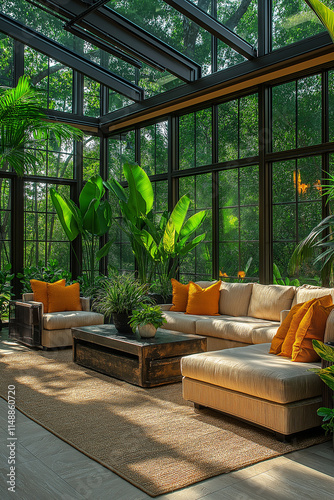 Jardin d’Hiver Contemporain avec Grandes Fenêtres en Verre, Sièges Confortables, Plantes Luxuriantes et Lumière Naturelle Douce, Ambiance Lumineuse et Relaxante
