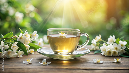 Jasmine Green Tea with Sun Rays and Blossoming Flowers on a Wooden Table