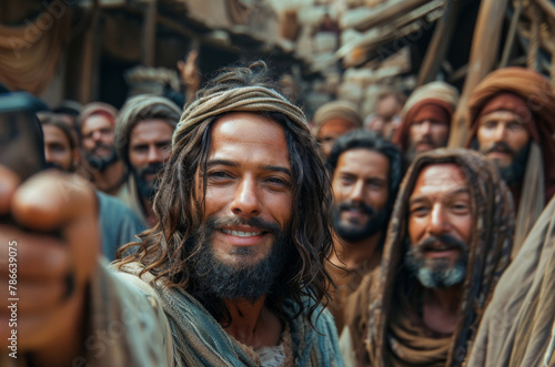 Jesus, portrait and selfie with group of people for religious experience, support and memory of worship. Faith, disciples and photography with prophet for leadership, gratitude and connection to God