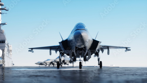 Jet , fighter on aircraft carrier in sea, ocean . War and weapon concept. 3d rendering.
