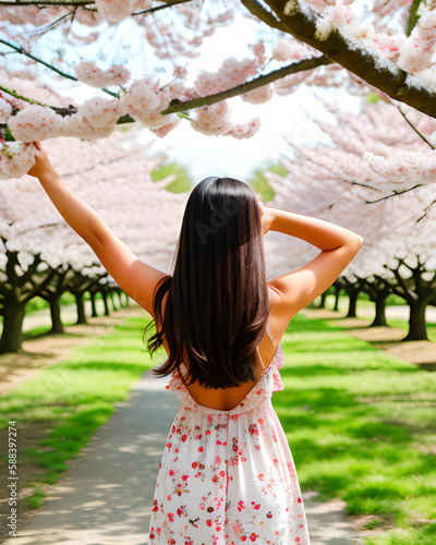 Jeune femme profitant de la nature printanière dans un verger de cerisiers en fleurs.IA générative.