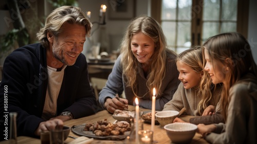 Joyful family of four savoring morning coffee at cozy breakfast table in their warm home
