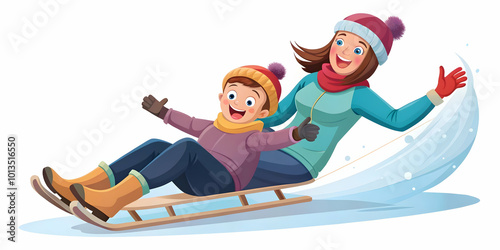 Joyful Flat Vector Illustration of Mother and Child Sledding Down a Snowy Hill, Capturing Heartwarming Candid Moments in Winter Play