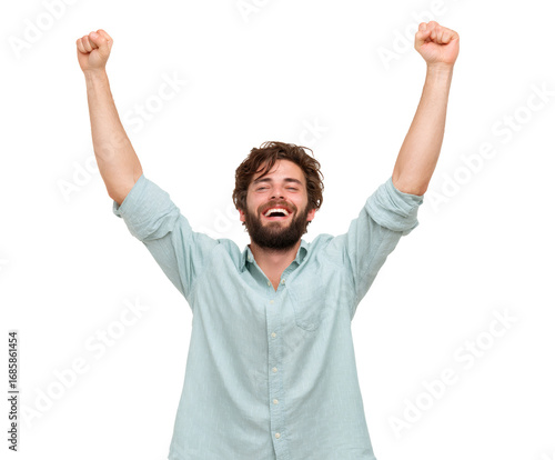 Joyful man celebrating success with raised arms