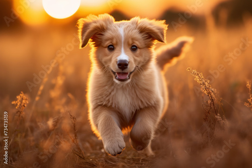 Joyful puppy running through field at sunset. Pet vitality and happiness.