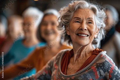 Joyful senior woman dancing in aerobics class with group of elderly, highlighting vitality, companionship, and active lifestyle in retirement