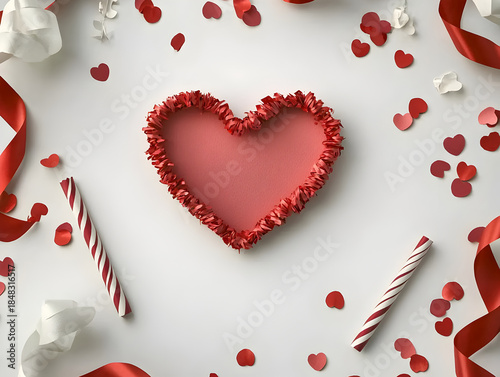 Joyful valentine day background with red heart frame, candy, and confetti for sweet, romantic love celebration