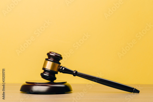Judge Gavel on a wooden table and yellow-orange background.