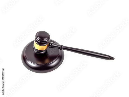 Judge's gavel for making a decision isolated on a white background. Auction hammer with wooden stand. The concept of law and justice.