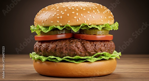 Juicy Beef Burger with Lettuce Tomato and Sesame Bun on Wooden Surface