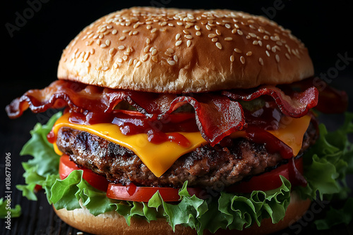 Juicy cheeseburger with crispy bacon and fresh lettuce served at a cozy diner in the evening. Generative AI