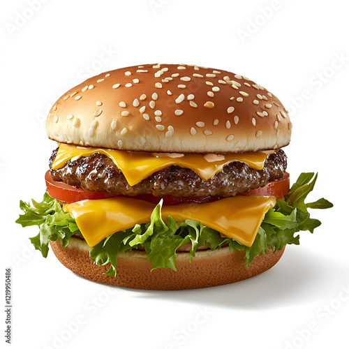 Juicy cheeseburger with sesame seed bun, lettuce, tomato, and melted cheese. A delicious fast food classic!
