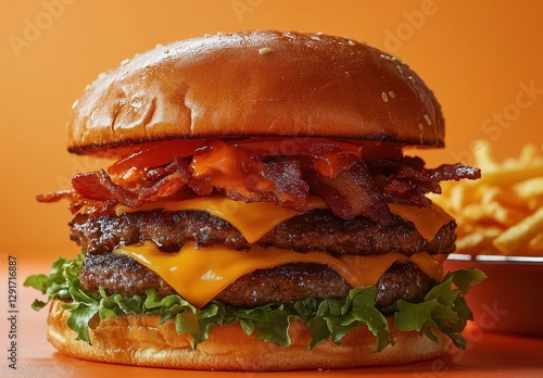 Juicy Double Bacon Cheeseburger with Fresh Lettuce and Tomato Served with Crispy French Fries on Orange Background