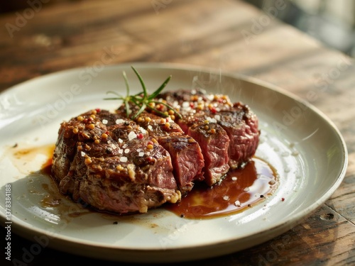 Juicy grilled steak served on a rustic plate with garnishes in a cozy restaurant setting