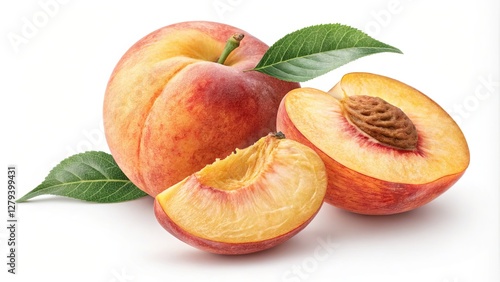 Juicy Peach Composition Whole and Sliced, White Background, Fresh Fruit, Peach Photography, Still Life Peach, Fruit