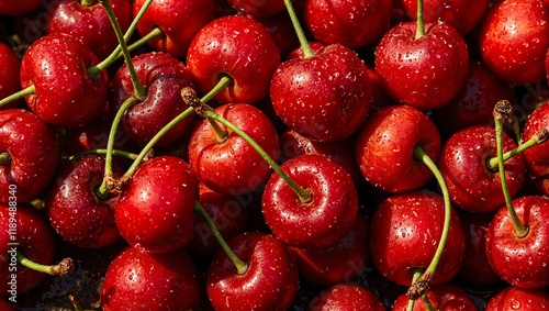 Juicy red cherries with drops of water on glossy skin under sunlight
