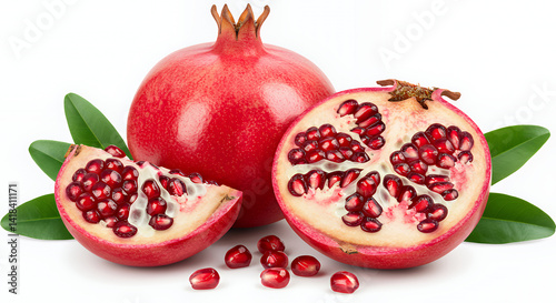 Juicy Red Pomegranate Fruit Slices with Green Leaves Isolated on White Background