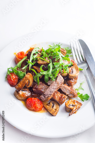 Juicy steak medium rare beef with arugula and grilled vegetables. Top view