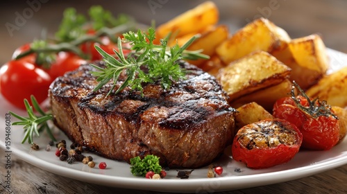 Juicy steak with rosemary, grilled tomato, and potatoes on a white plate. Showcase food blog posts, restaurant ads, or culinary articles perfectly.