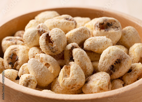 Jumbo corn baked goods in a wooden bowl set against a wooden background