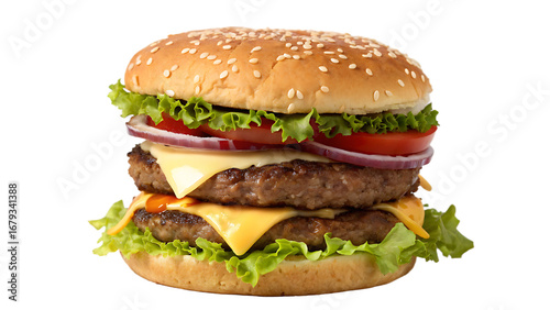 Jumbo fast food burger with two patties, lettuce, tomato, cheese, onion, sesame bun, white background